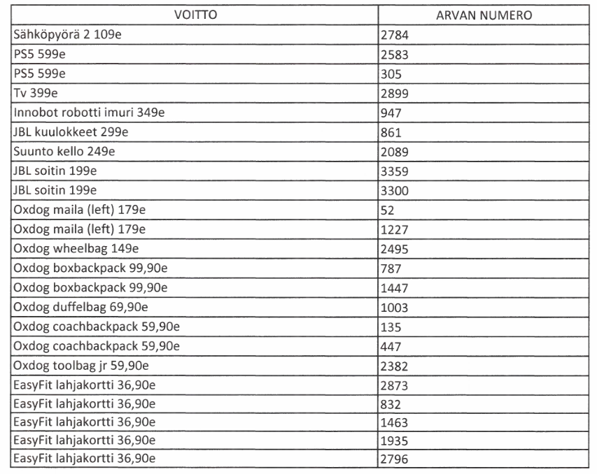 Alla lista arvonnan voittaneista. Voitot on lunastettavissa kahden kuukauden ajan SB Vaasan toimistolta (matildantie 2). Sovithan noudosta etukäteen mikael.aromaa@sbvaasa.fi tai 040-6507573.